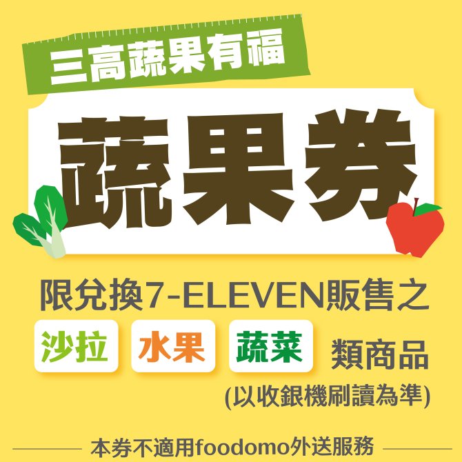 完成三項任務,每人最高可獲得300元7-ELEVEN蔬果券(開心卡),可直接至全台7-ELEVEN門市兌換蔬菜、水果或沙拉,讓健康飲食成為可實踐的日常選擇。