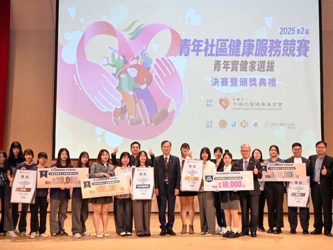為鼓勵醫學及健康相關系所青年積極投身健康促進領域,以專業改變社區,由統一企業、統一超商共同捐助的千禧之愛健康基金會,繼2023年第一屆,11月1日再度舉辦第二屆「青年社區健康服務競賽~青年實健家選拔」決賽暨頒獎典禮。今年全國總共有來自19校、33系所組成的27個隊伍報名參加,分「肌少症」、「營養保健」與「代謝症候群」三組競賽。在經過激烈競爭後,各組分別由國防公衛、靜宜食品營養、中臺科大護理奪冠,成為2025青年實健家團隊。