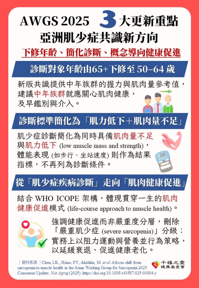 2025年11月,亞洲肌少症工作小組 (AWGS) 在頂尖期刊Nature Aging發表了最新共識,提出三項關鍵更新: